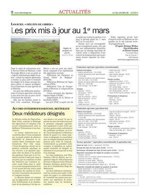 Les prix TVAC ci-après ont été acceptés par toutes les parties, et ce pour la période allant du 1er mars 2017 au 31 août 2017.