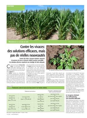 Les tubercules de souchet se trouvant à différentes profondeurs dans le sol, l’apparition des plantules est assez étalée dans le temps et la lutte nécessite deux passages (tableau 2). Le premier s’effectue au stade 5 à 15 cm des souchets, vers le stade 5e et 6e feuille visible du maïs. Une destruction de 99 % peut être obtenue avec un traitement Zeus 1 l + Onyx 0,75 l ou Osorno (ou Callisto) 0,5 l + Zeus 0,5 l + Onyx 0,75 l suivi d’un second traitement appliqué deux semaines après le premier avec Osorno 1 l + Onyx 0,75 l.