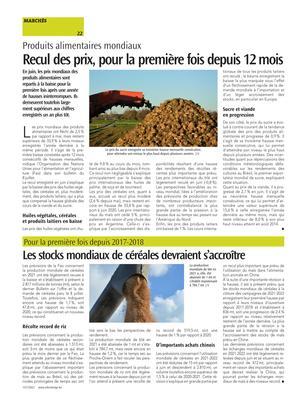 Les prix mondiaux des produits alimentaires ont fléchi de 2,5 % par rapport à mai, mais restent supérieurs de 33,9 % à leurs niveaux enregistrés l’année dernière à la même période. Il s’agit de la première baisse constatée après 12 mois consécutifs de hausses mensuelles, indique l’Organisation des Nations Unies pour l’alimentation et l’agriculture (Fao) dans son bulletin du 8 juillet.