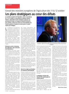 Les ministres européens de l’Agriculture, réunis à Luxembourg les 11 et 12 octobre, se sont penchés sur plusieurs dossiers brûlants : préparatifs des plans stratégiques nationaux, qui permettent de mettre en musique la nouvelle PAC dans les pays membres, analyse des normes de commercialisation des marchés agricoles, et situation du secteur porcin. Un point soulevé par la Belgique.