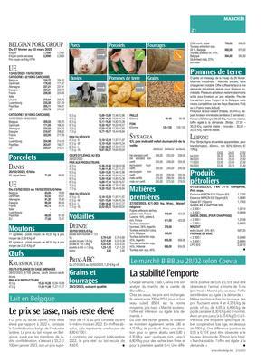 Du côté des vaches grasses, la cotation se maintient également : entre 3,80 et 4,15 €/kg de poids vif. Avec une direction pour ce genre abattu vers 5,80 à 6,35 €/kg avec quelques pics jusqu’à 6,40 €/kg pour des vaches bien finies et pour la première qualité (S+). Une différence positive de 0,05 à 0,10 € peut être observée si l’animal a moins de 5 ans (prix htva). « Marché plus soutenu : l’offre est inférieure ou égale à la demande. »