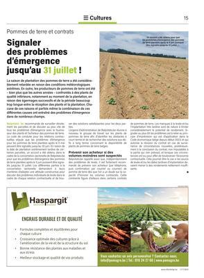 Le code de conduite pour les relations contractuelles stipule que les problèmes d’émergence pour les pommes de terre plantées après le 5 mai peuvent être signalés jusqu’au 30 juin. En raison de la date de plantation extrêmement tardive de certaines parcelles, un accord a été obtenu dans le cadre de la concertation sectorielle de Belpotato.be pour que les problèmes d’émergence des pommes de terre plantées après le 5 juin puissent être signalés jusqu’au 31 juillet. Les différentes parties à la concertation sectorielle demandent à leurs membres d’adopter une attitude constructive pour discuter des problèmes individuels de levée dans le cadre de chaque relation contractuelle et de trouver des solutions satisfaisantes pour les deux parties.