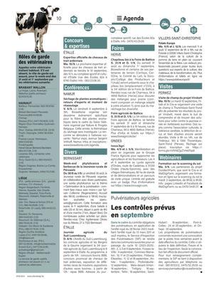 Dans le cadre du contrôle obligatoire des pulvérisateurs, en application de l’arrêté royal du 28 février 2023 modifiant l’arrêté royal du 13 mars 2011 et sauf imprévu, le Service d’Inspection des Pulvérisateurs (SIP) se rendra dans les communes suivantes pour un passage du cycle 10 (2023-2025) : Ath : 2, 3, 5 et 9 septembre ; Fosses-la-Ville : 4 septembre ; Comines-Warneton : 10, 17 et 23 septembre ; Flobecq-Ellezelles : 11, 12 et 18 septembre ; Anhée : 11 septembre ; Profondeville : 12 septembre ; Meix-devant-Virton : 16 septembre ; Tintigny : 16 septembre ; Tellin : 18 septembre ; Saint-Hubert : 18 septembre ; Pont-à-Celles : 24 et 25 septembre ; et Onhaye : 30 septembre.