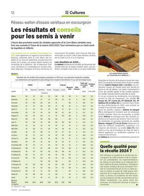 Afin d’évaluer la qualité de la récolte des escourgeons de cette moisson et de la comparer aux précédentes, les expérimentateurs du réseau se sont basés sur le mélange de 3 lieux wallons (Acosse, Gembloux, Terwagne) des essais variétaux de post-inscription menés en conventionnel par le Cra-w. Cette année, le calibre et poids de 1.000 grains sont proches de la moyenne des 9 dernières années. La teneur en protéines est très haute car les protéines ont été concentrées par les faibles rendements. Les pluies avant les moissons ont fortement diminué le poids à l’hectolitre....