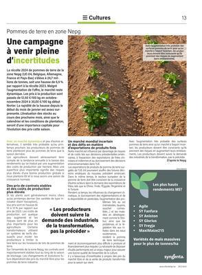 Si les plants sont généralement moins chers qu’au printemps dernier (les variétés de type Innovator étant l’exception), leur prix sont en hausse de 10 à 15 % par rapport aux prix de 2023. Les coûts de production ont quelque peu augmenté et les risques sont de plus en plus importants pour les agriculteurs. Certains transformateurs utilisent un système de tarifs dissuasifs pour inciter les producteurs à limiter la tare terre sur les livraisons de lots de pommes de terre.