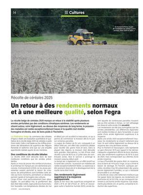 Pour le froment et l’escourgeon, cela représente un gain d’environ 30 % par rapport à l’an dernier. L’épeautre a également affiché de bons résultats, avec des rendements supérieurs de 50 % à ceux de 2024, mais correspondant aux attentes d’une année moyenne.