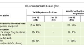 Pour les variétés un peu plus tardives et plus fréquemment valorisées en grain humide (Bismark, Plesant…), ces teneurs sont passées de 37 % à 34,3 % en moyenne ce qui représente une perte d’humidité de 2,5 %. Pour les agriculteurs qui souhaiteraient valoriser le maïs en grain humide ou en épi broyé, les récoltes sont en cours.