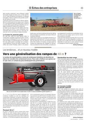 Pourquoi 48 m ? Premièrement, il s’agit d’un multiple de 12 m, largeur adoptée par un nombre croissant d’outils de travail du sol et semoirs. Deuxièmement, plus la taille de la rampe augmente, plus le nombre de passage diminue. Sur une parcelle de 100 ha, adopter une telle rampe permet d’économiser 2,5 passages. Avec pour corollaire, toujours selon M. Leeb, que la réduction du nombre de traces de roues accroît la surface cultivée et, par conséquent, la marge. On admettra toutefois que la question des parcelles de 100 ha ne se pose pas en Belgique…