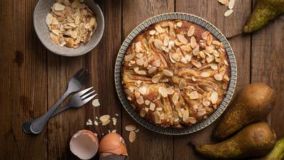 Étaler la pâte sur un plan légèrement fariné et foncer un moule à tarte beurré. Piquer le fond à la fourchette. Étaler la crème frangipane sur toute la surface, puis disposer les poires en rosace, légèrement enfoncées dans la crème. Parsemer d’amandes effilées.